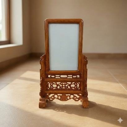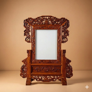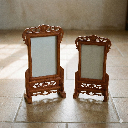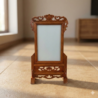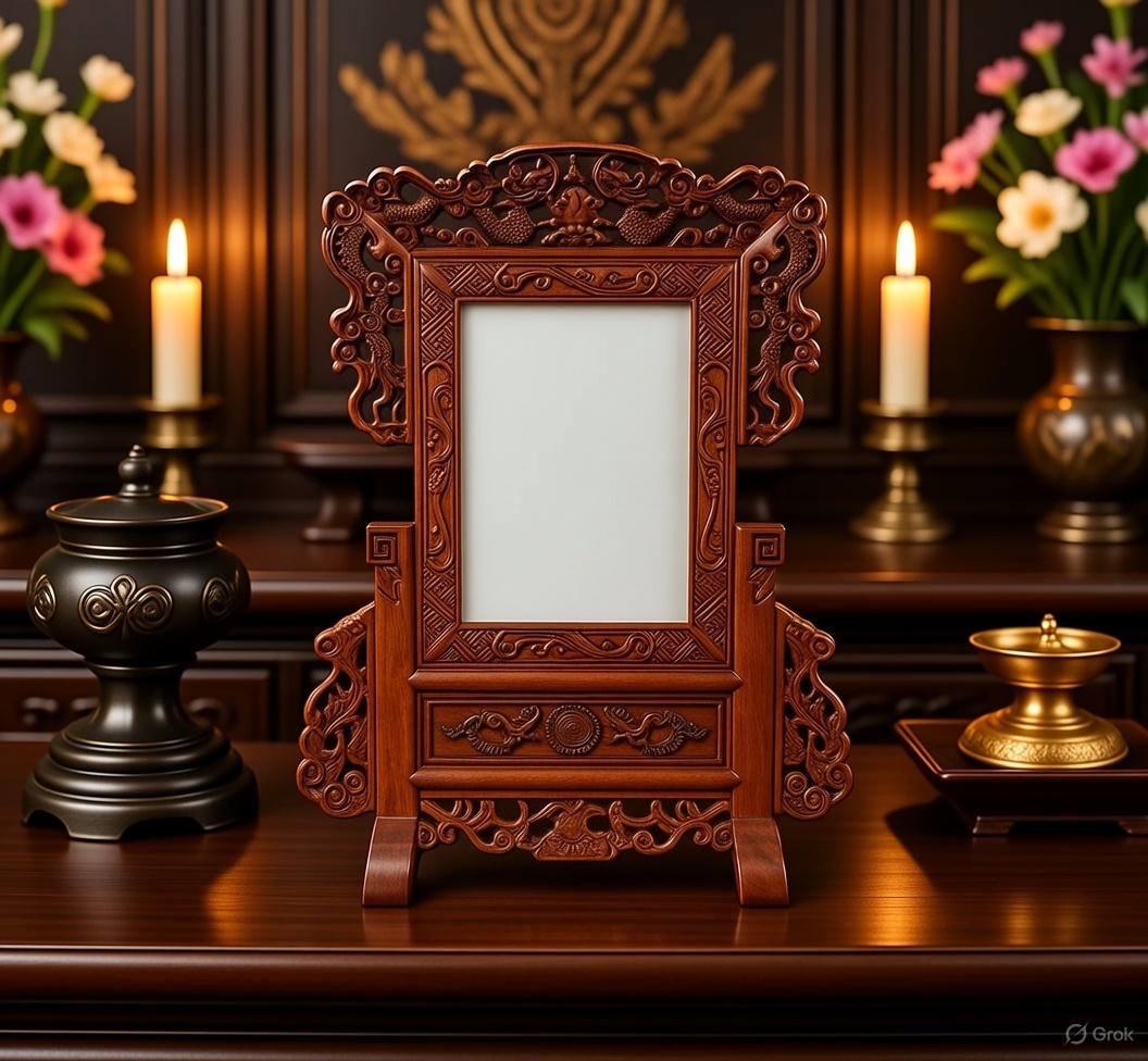 Khung ảnh thờ Tứ Linh được chế tác từ gỗ Hương tự nhiên, chạm khắc Long – Lân – Quy – Phụng sắc nét, tượng trưng cho phúc khí, bình an và sự che chở cho gia đạo. Kết cấu khung chắc chắn, chân đế vững vàng, phù hợp đặt trang trọng trên bàn thờ gia tiên. Màu gỗ trầm ấm, vân đẹp tự nhiên, mang lại cảm giác uy nghi và bền bỉ theo thời gian.