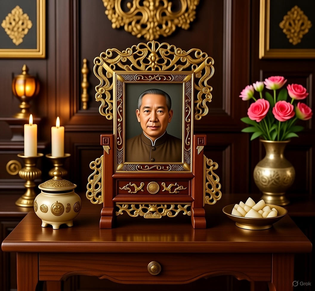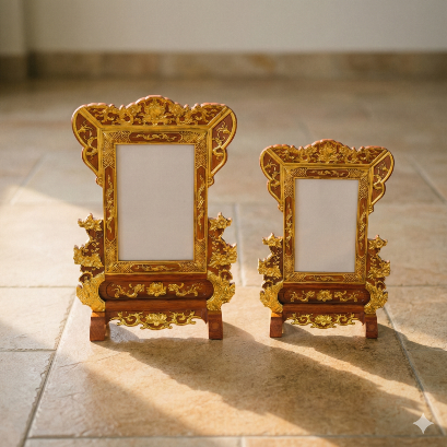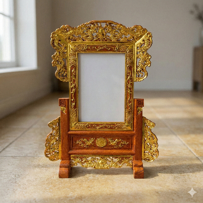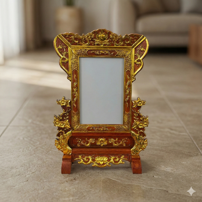 Phiên bản Tứ Linh dát vàng Đài Loan nổi bật với các chi tiết hoa văn được nhấn vàng tinh tế, giúp khung ảnh thêm phần sang trọng và linh thiêng. Sự kết hợp giữa gỗ Hương và dát vàng tạo chiều sâu thị giác, rất phù hợp với không gian thờ truyền thống hoặc bàn thờ lớn. Khung đứng vững, hoàn thiện chỉn chu, thể hiện sự thành kính và trân trọng đối với tổ tiên.
